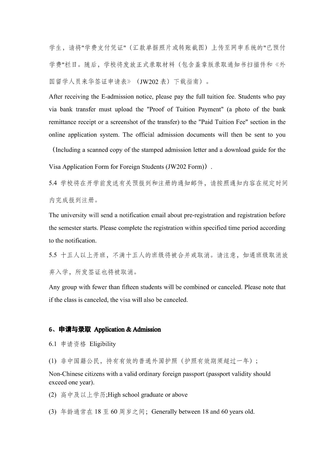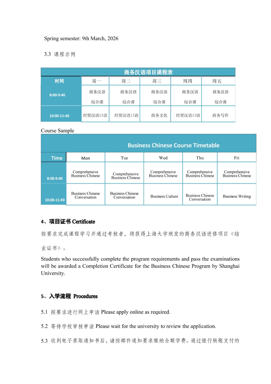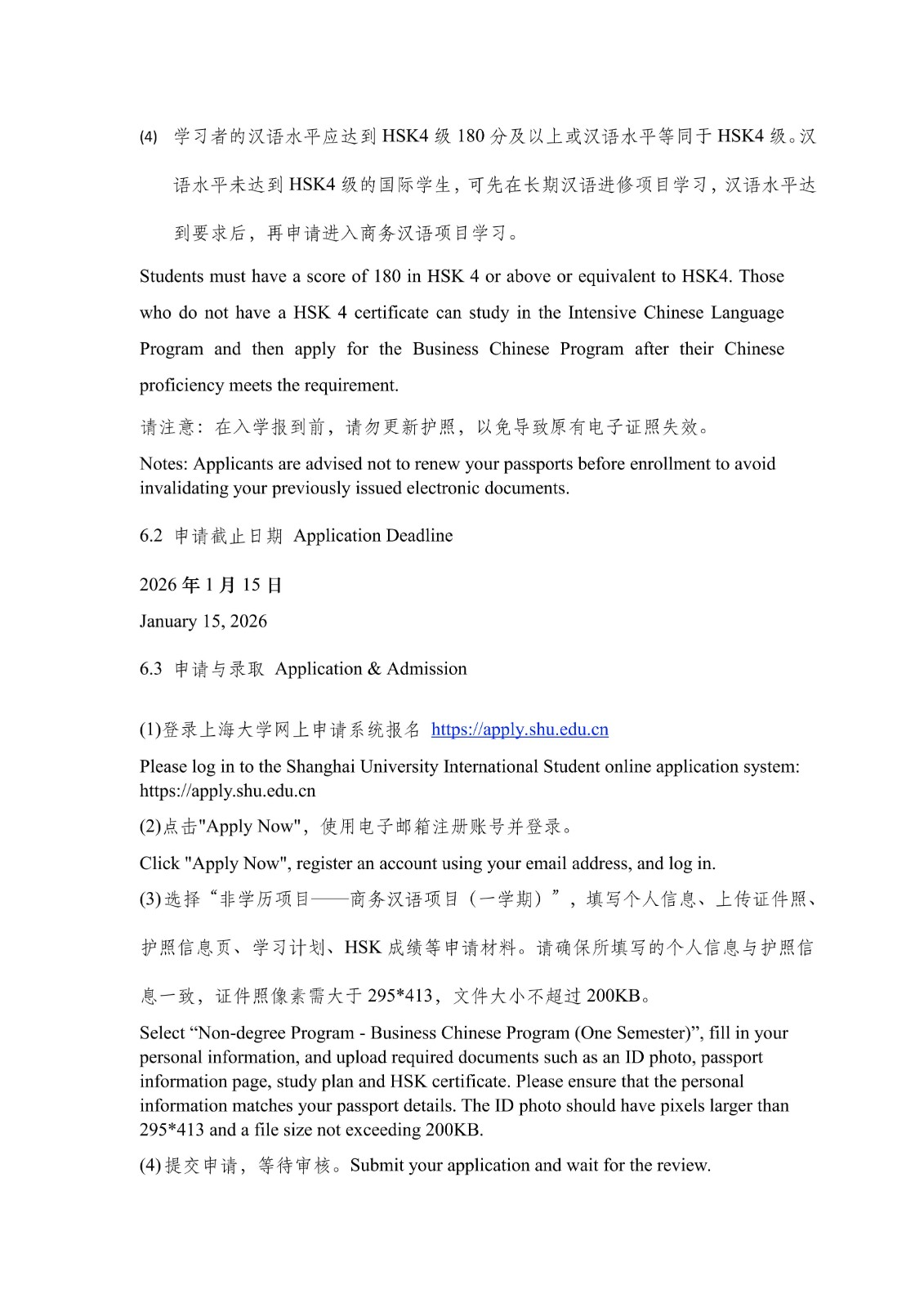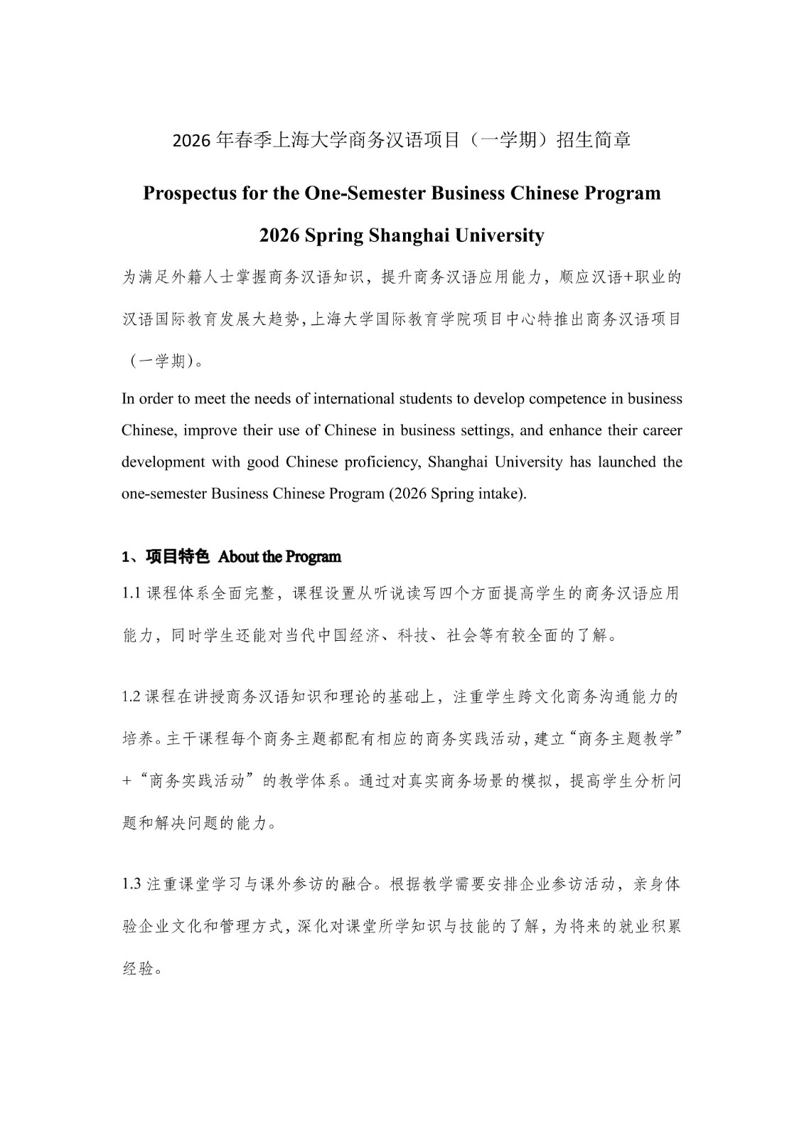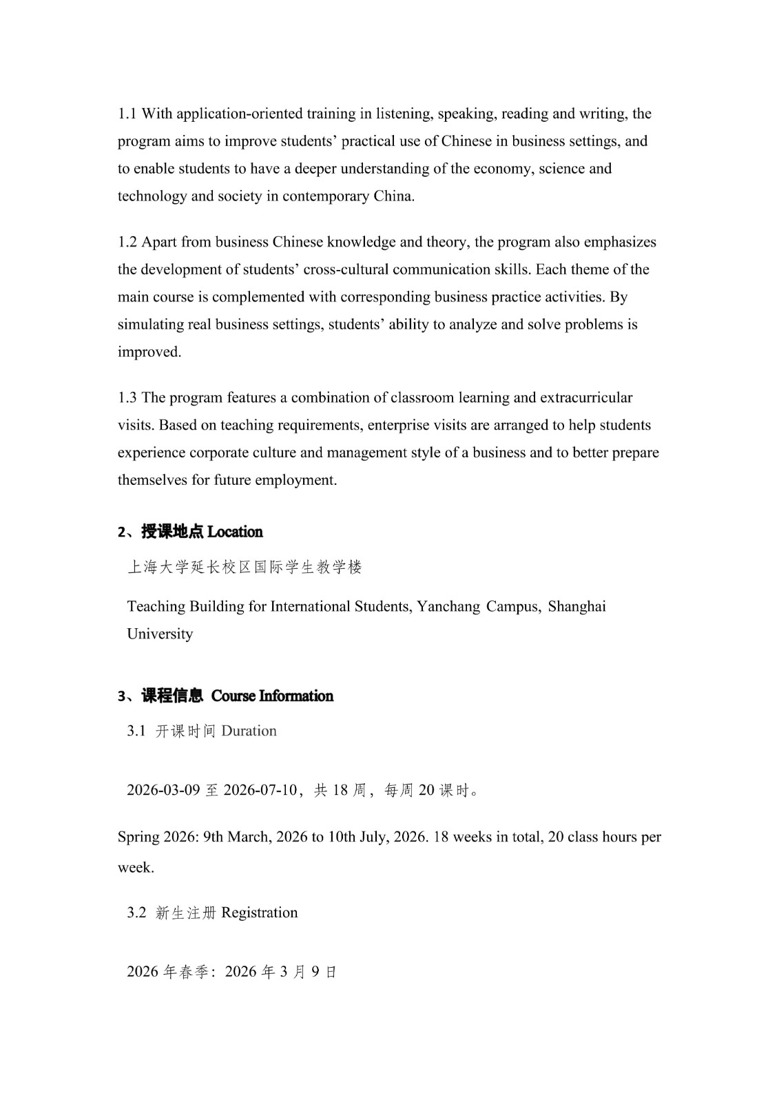 Prospectus for the One-Semester Business Chinese Program 2026 Spring Shanghai University