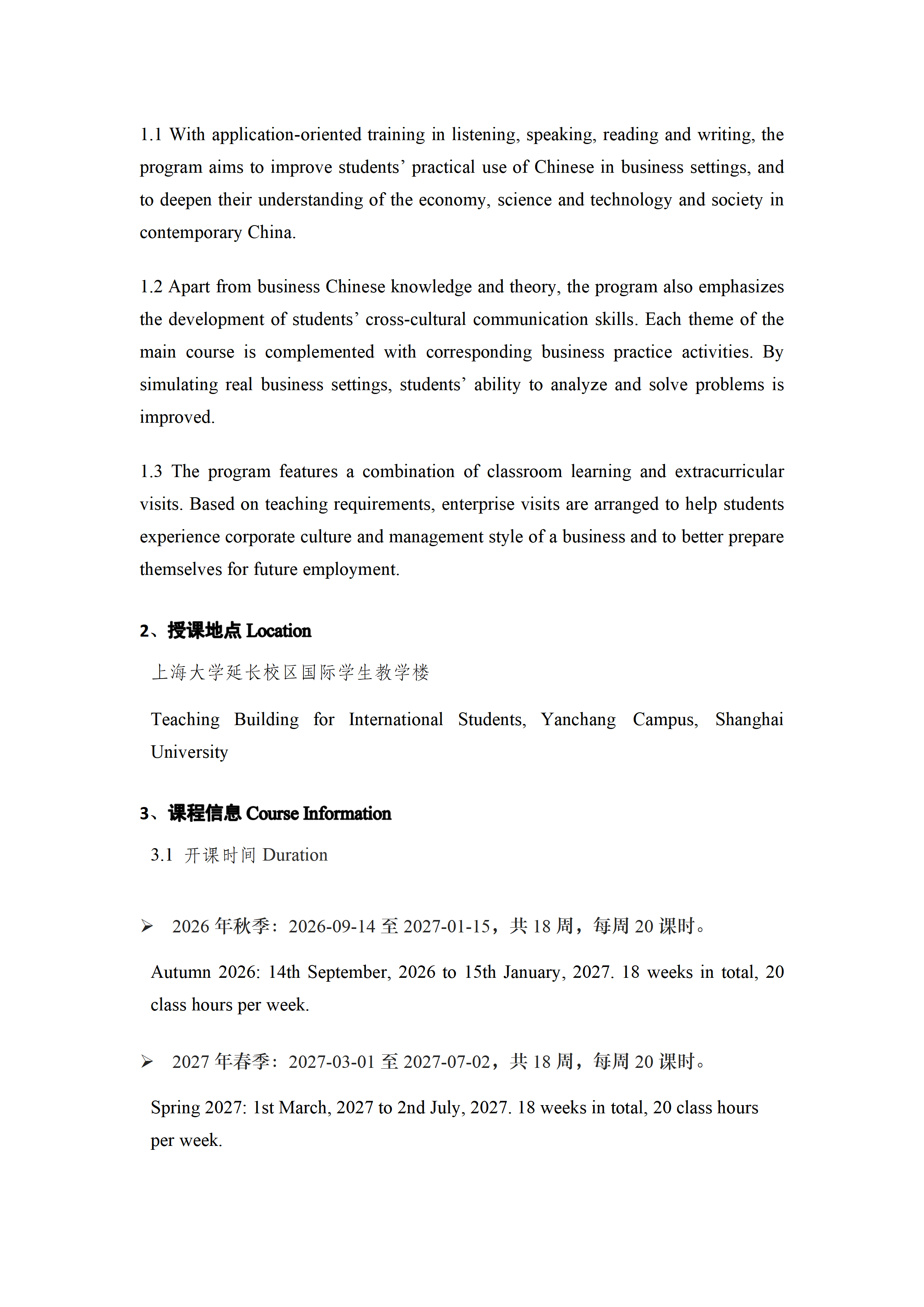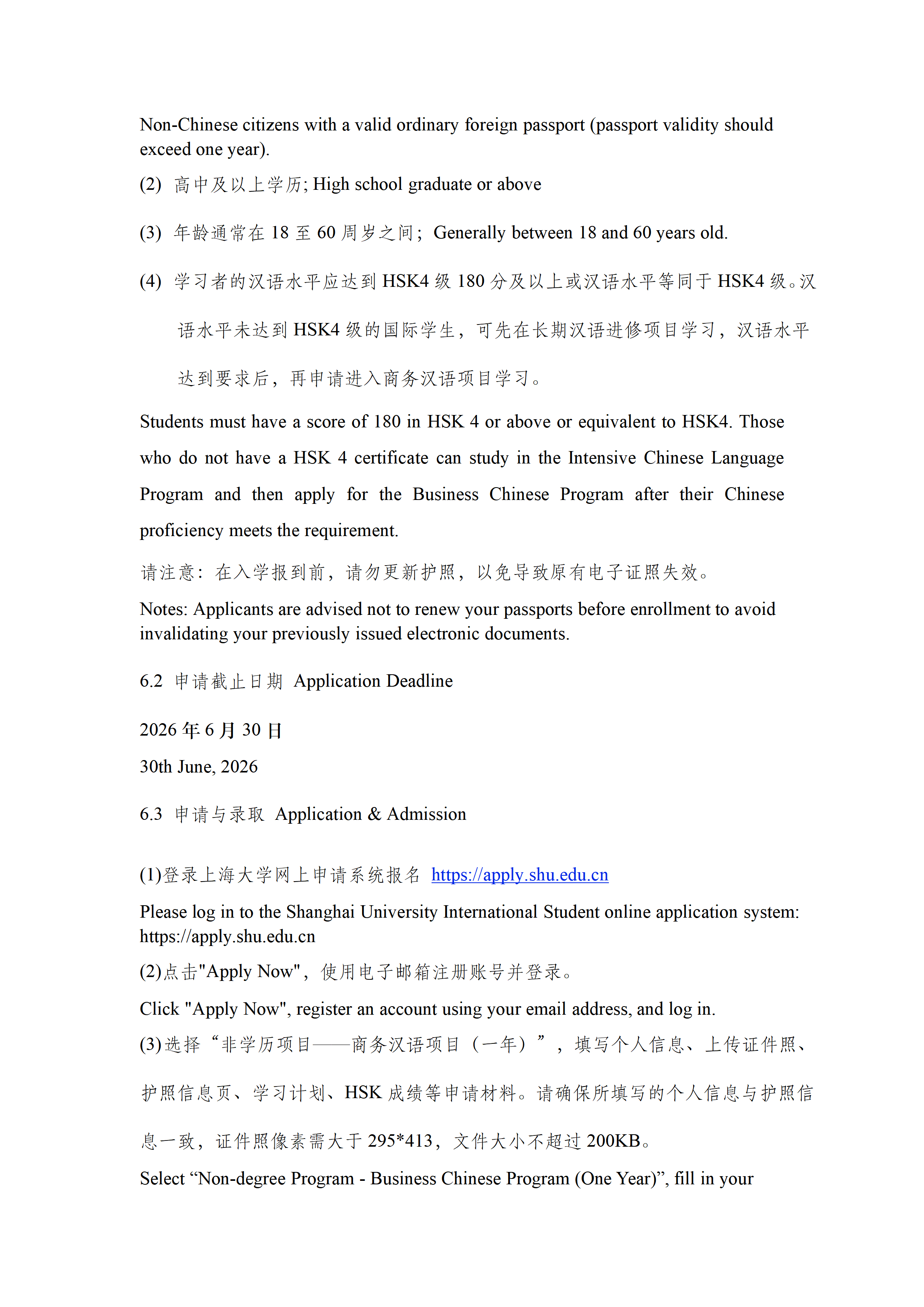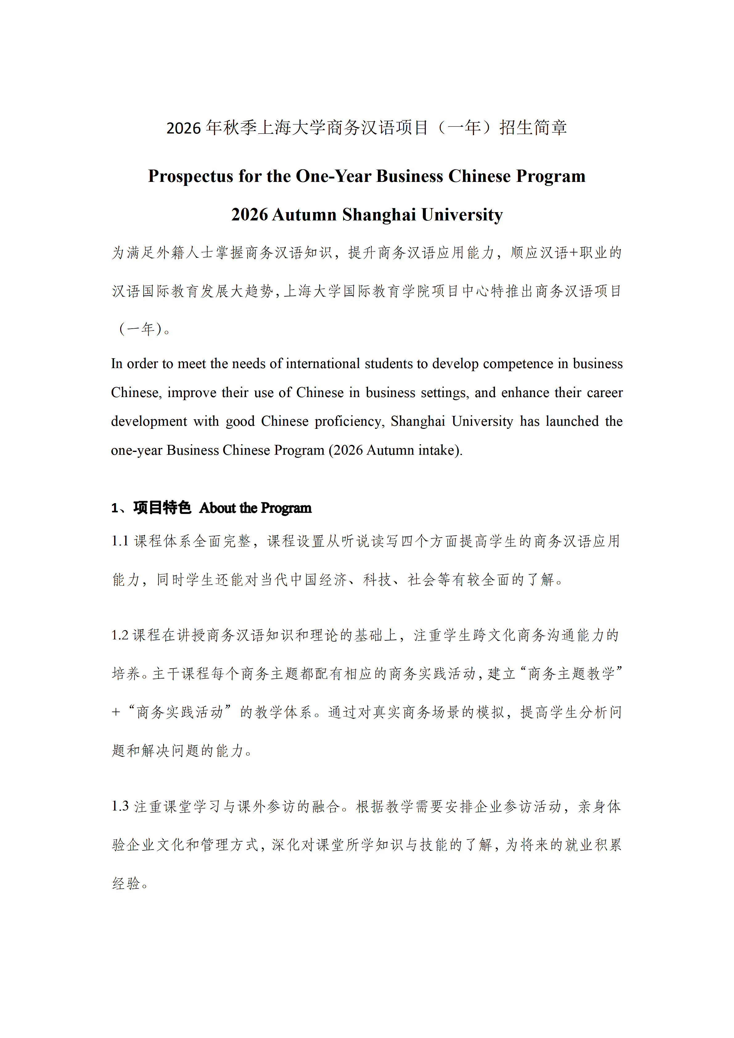 2026年秋季上海大学商务汉语项目(一年)招生简章
