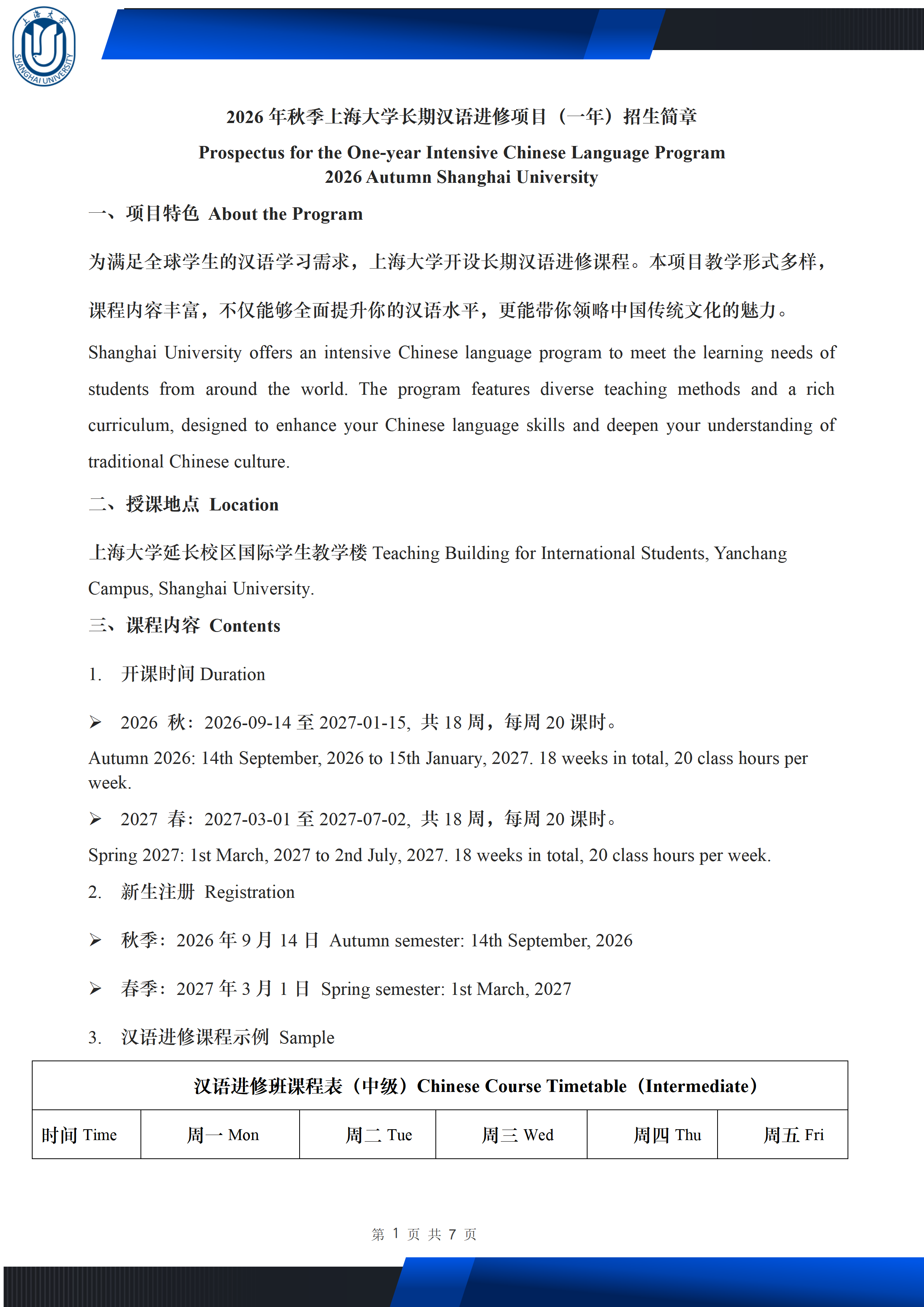 2026年秋季上海大学长期汉语进修项目(一年)招生简章